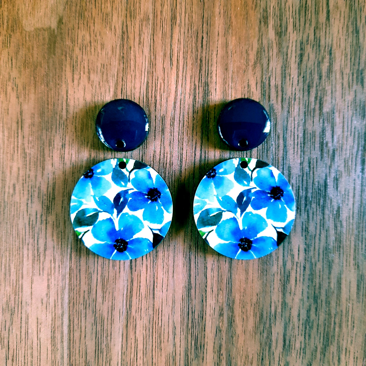 Two-part 27mm blue flower earrings, with navy blue epoxy connectors. It has a 1.8mm hole at the top.