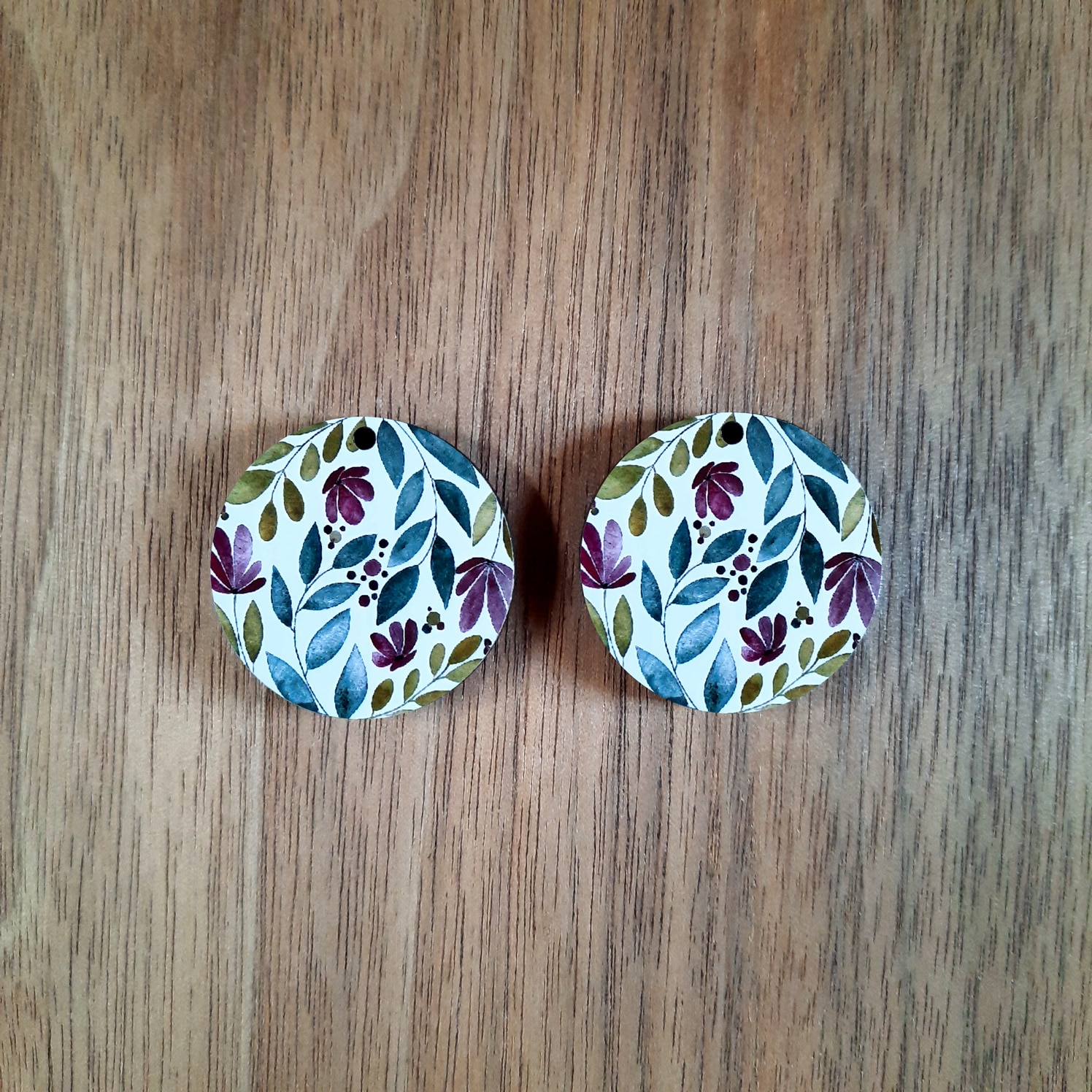 27mm round abstract floral wooden earrings. The hole at the top is 1.8mm. It has a glossy finish with plain wood at the back.