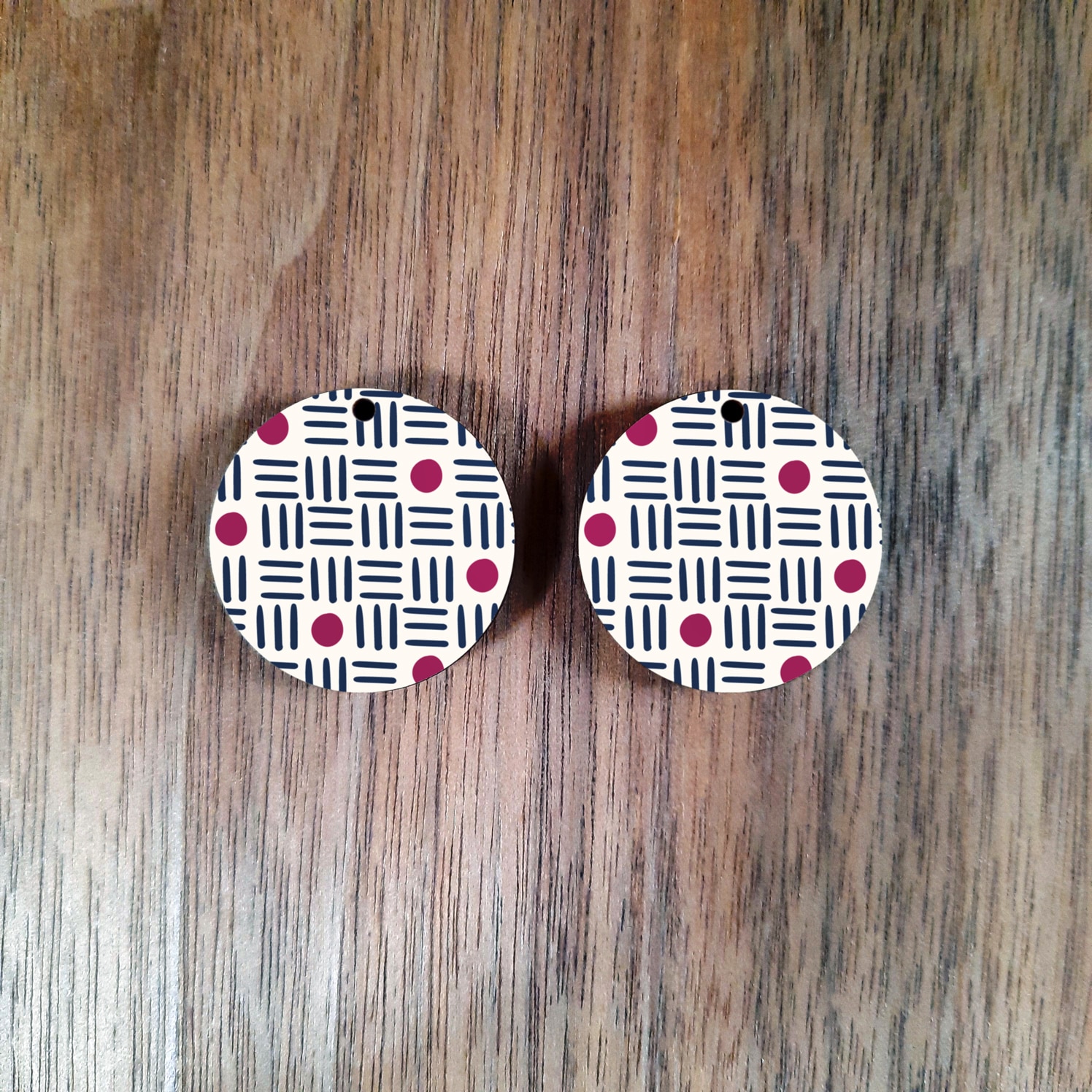27mm round stripes and dots wooden earrings. The hole at the top is 1.8mm. It has a glossy finish with plain wood at the back.