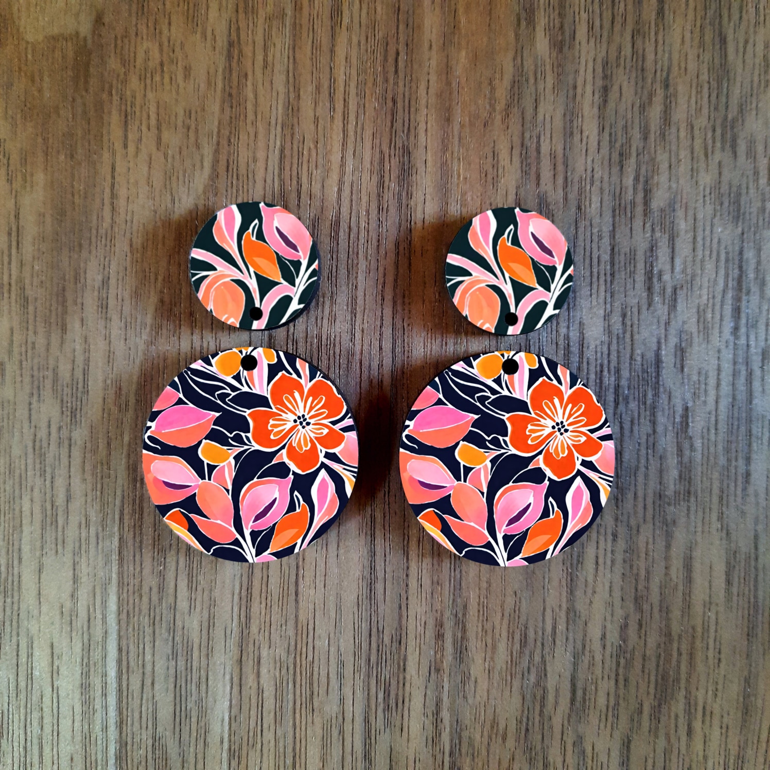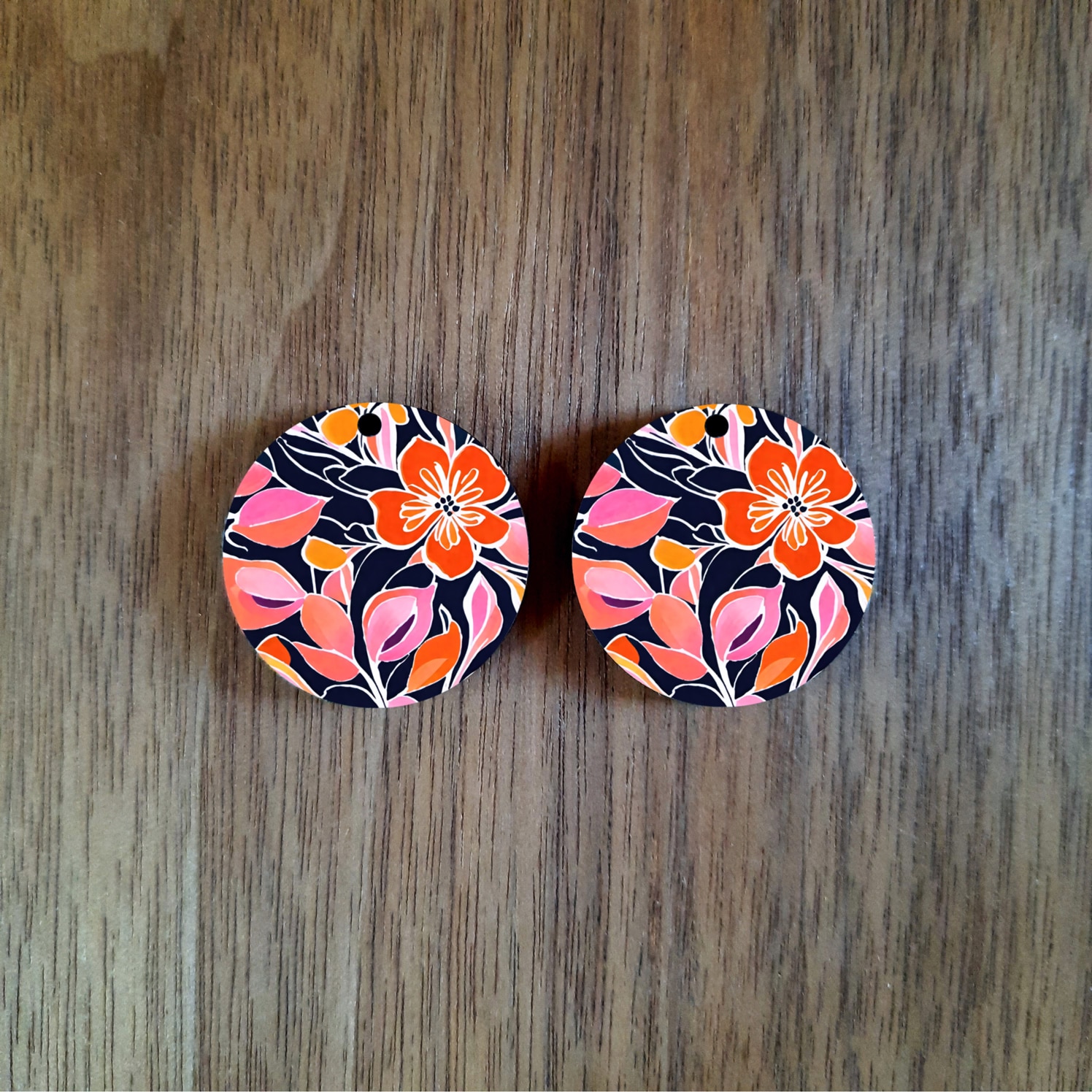 27mm round orange and pink wooden earrings. The hole at the top is 1.8mm. It has a glossy finish with plain wood at the back.