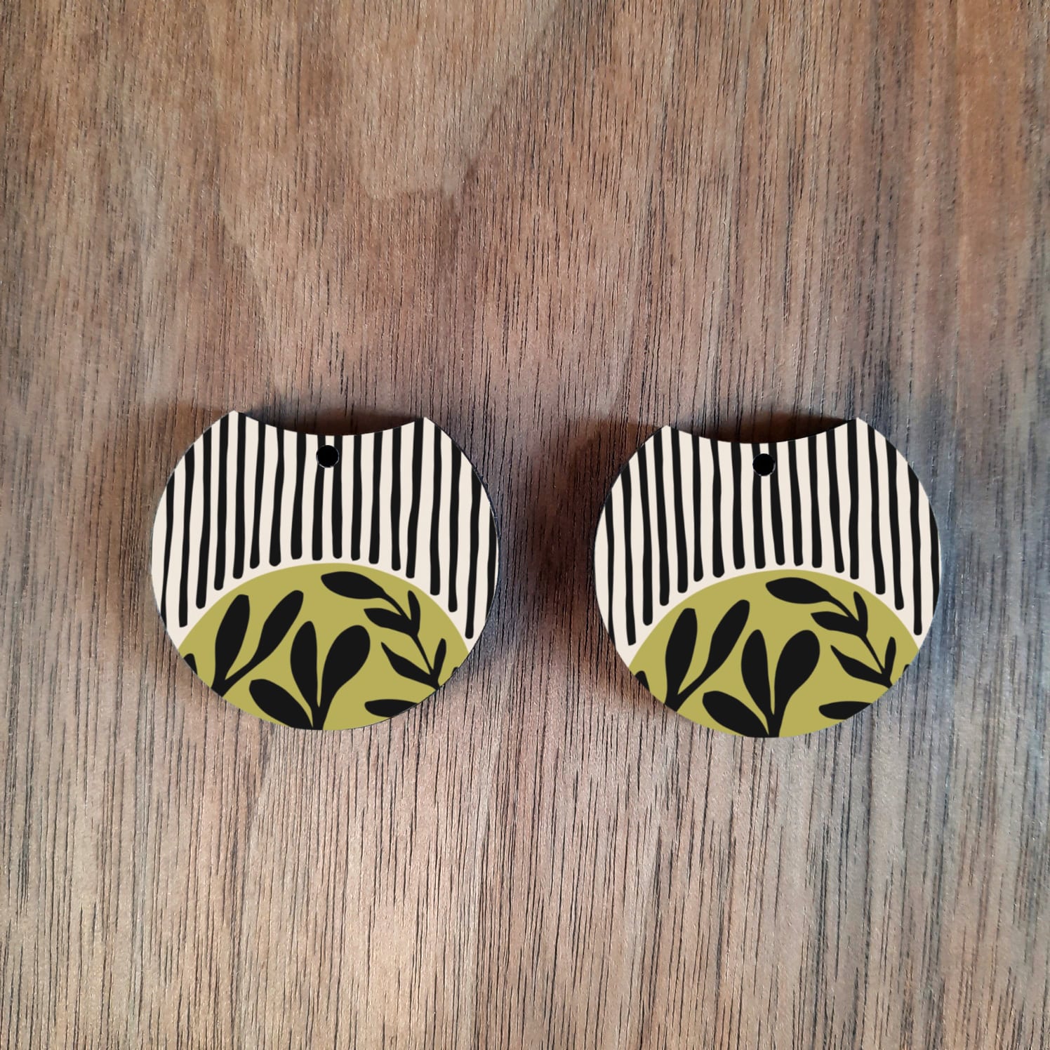 32mm round cutout abstract lines earrings. The hole at the top is 1.8mm. It has a glossy finish and is painted dark grey on the back.