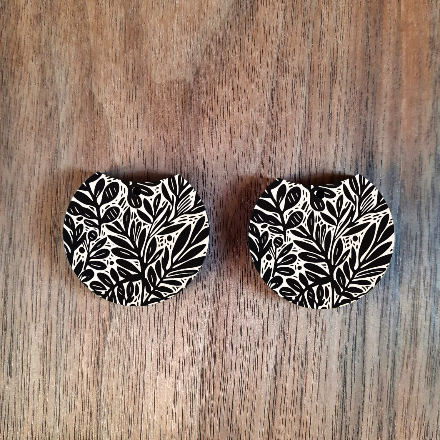32mm round cutout black leaf earrings. The hole at the top is 1.8mm. It has a glossy finish and is painted dark grey on the back.