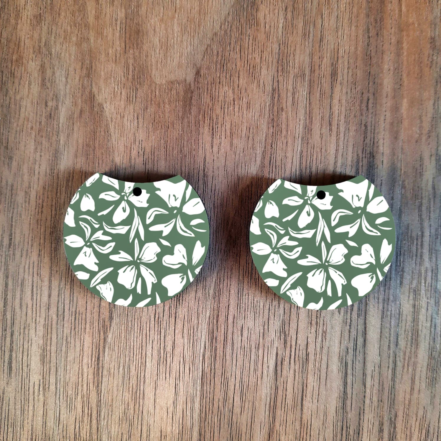 32mm round cutout green with white floral earrings. The hole at the top is 1.8mm. It has a glossy finish and is painted dark grey on the back.