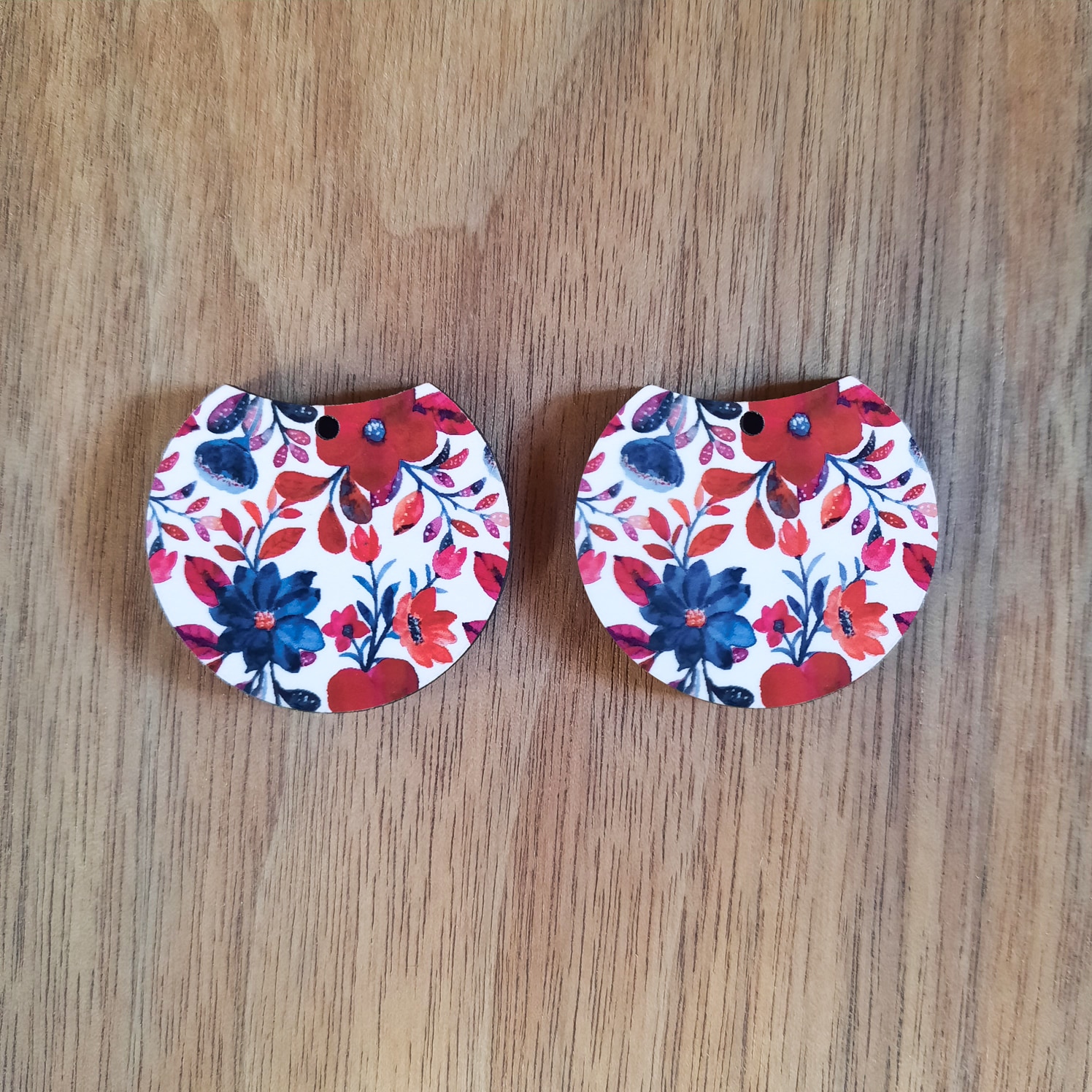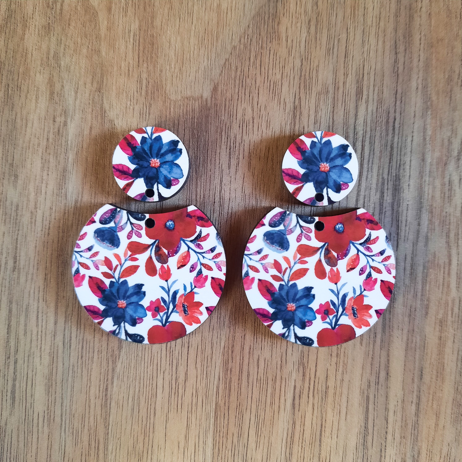Sublimated 32mm round cutout red and blue earrings. The hole at the top is 1.8mm. It has a glossy finish with plain wood at the back.