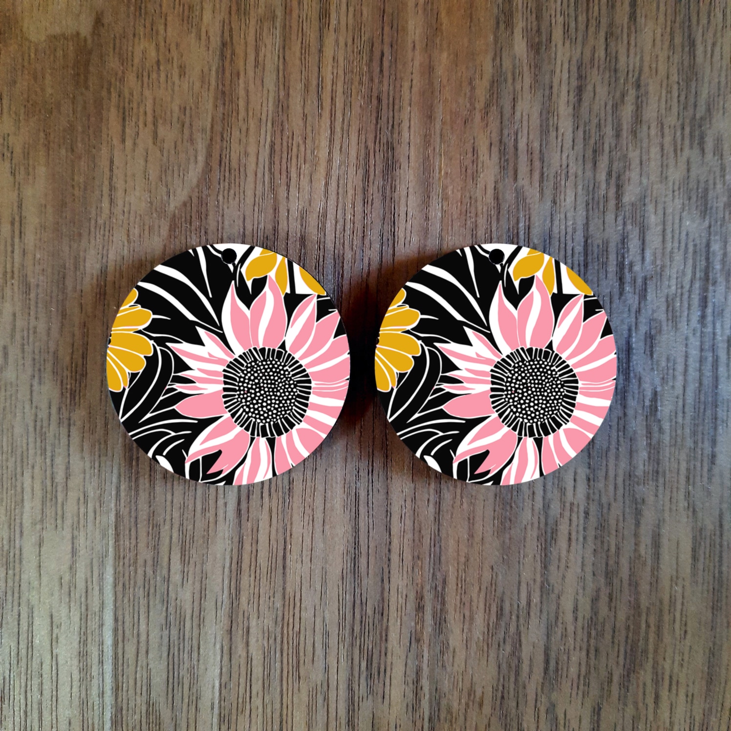 32mm round earrings – Pink and yellow flowers. The hole at the top is 1.8mm. It has a glossy finish and is painted dark grey on the back.