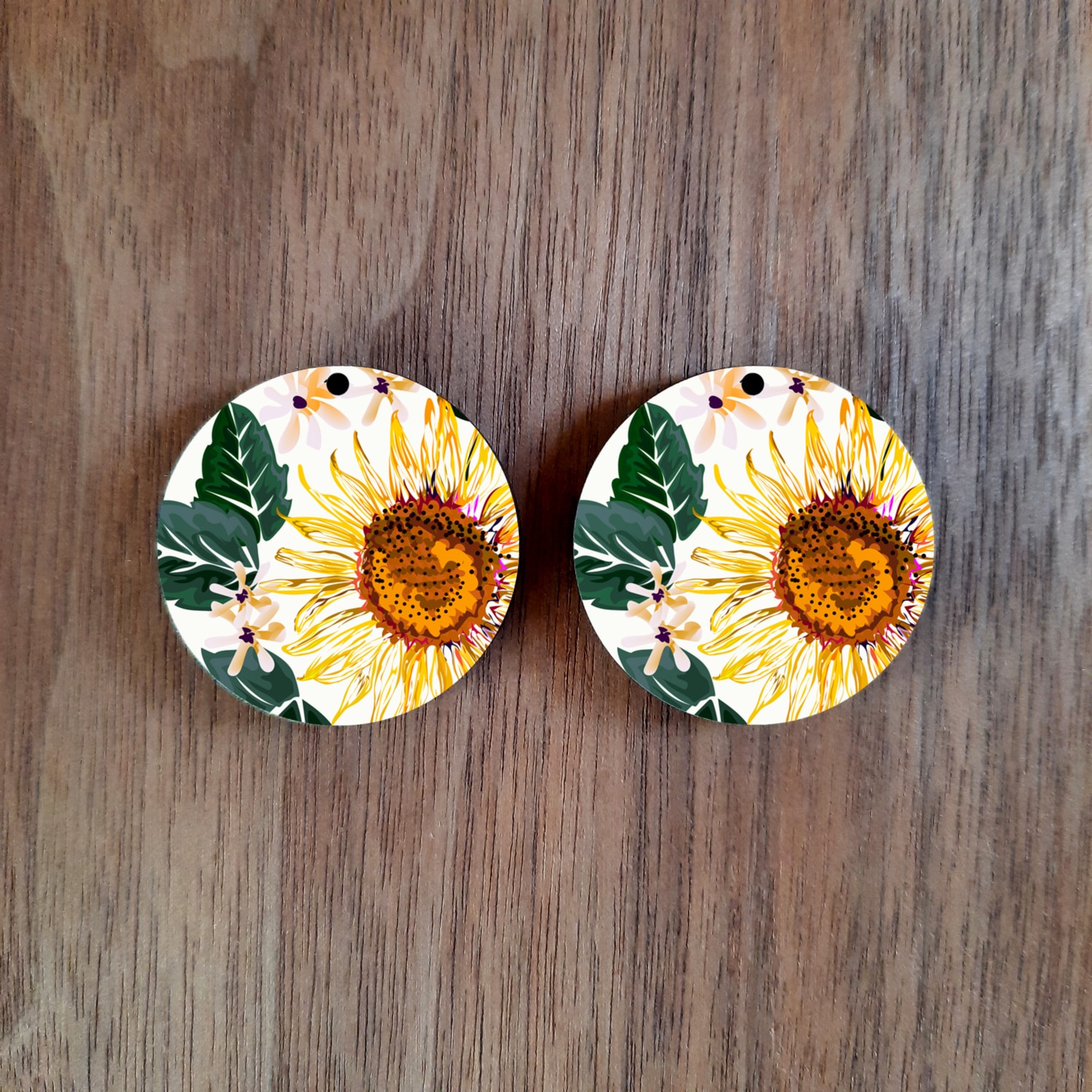 32mm round earrings – Sunflower. The hole at the top is 1.8mm. It has a glossy finish with plain wood at the back.