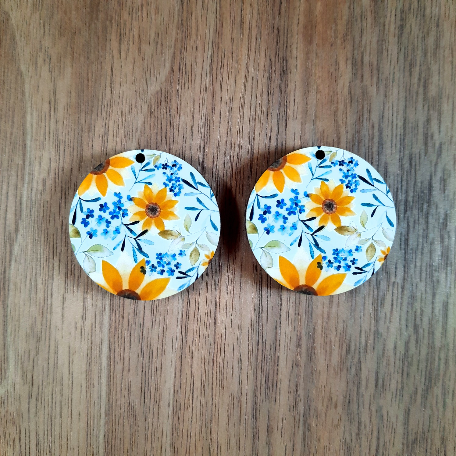 32mm round watercolor sunflower wooden earrings. The hole at the top is 1.8mm. It has a glossy finish with plain wood at the back.