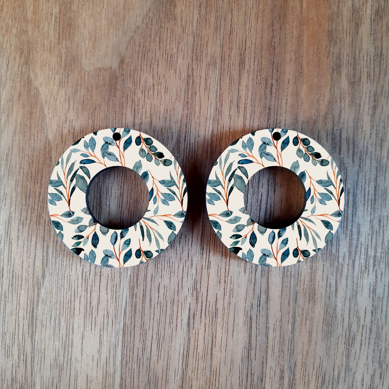 35mm doughnut-shaped earrings with autumn leaves print. It has a glossy finish with plain wood at the back.