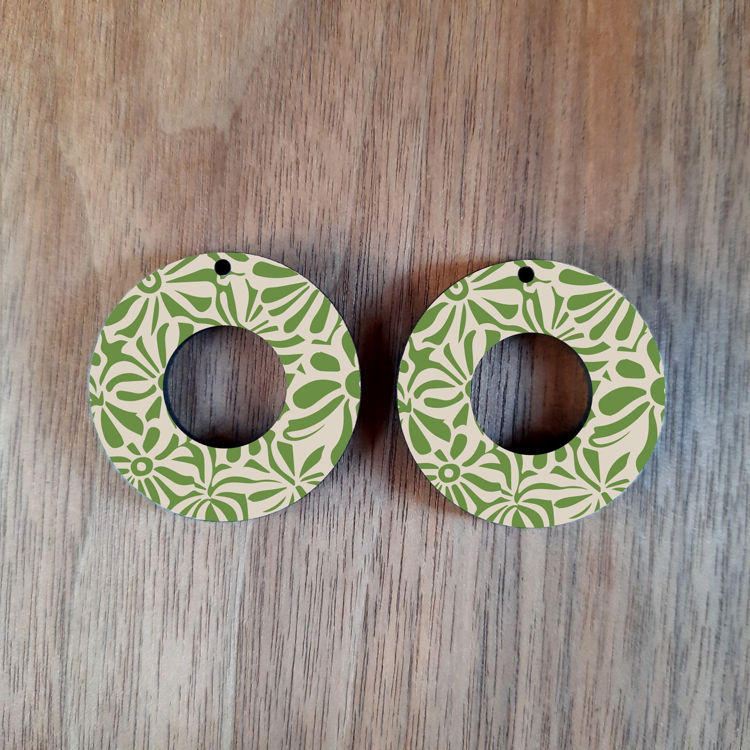 35mm doughnut-shaped earrings with a green floral print. It has a glossy finish with plain wood at the back.