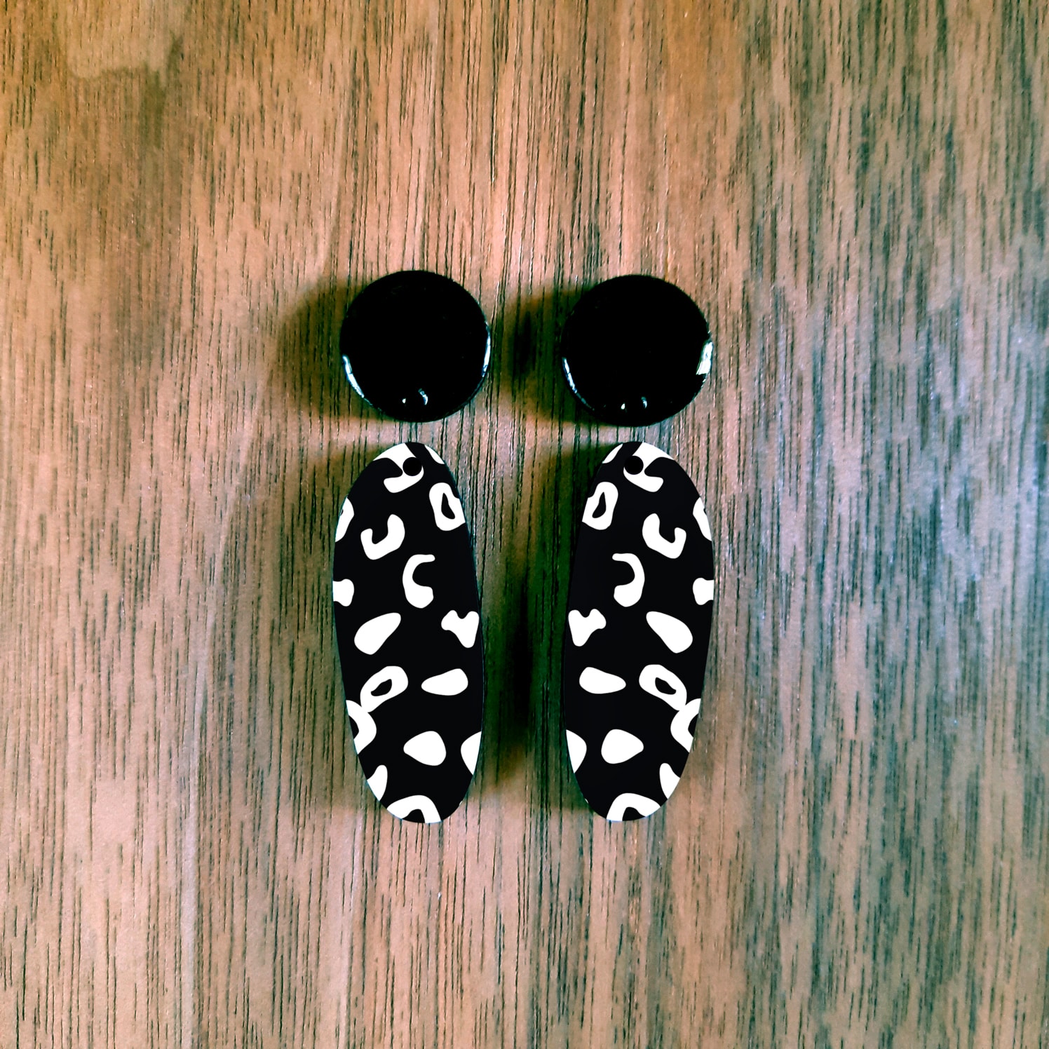 Two-part black with white earrings. It comes with epoxy connectors. It has a 1.8mm hole at the top.