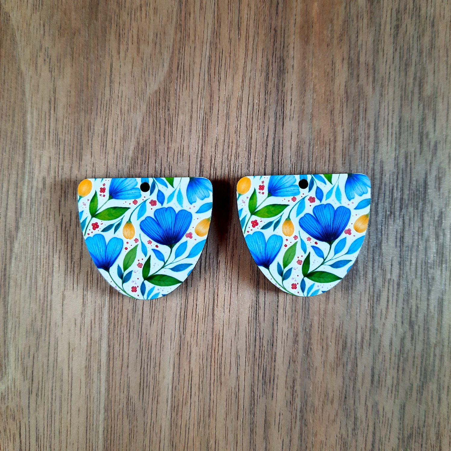 Hand-painted blue flower pattern earrings. The hole at the top is 1.8mm. It has a glossy finish with plain wood at the back.