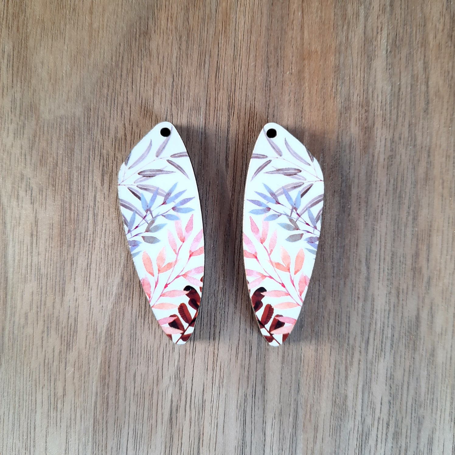 They have a sublimated autumn leaf print at the front with a 1.8mm hole at the top and plain wood at the back.