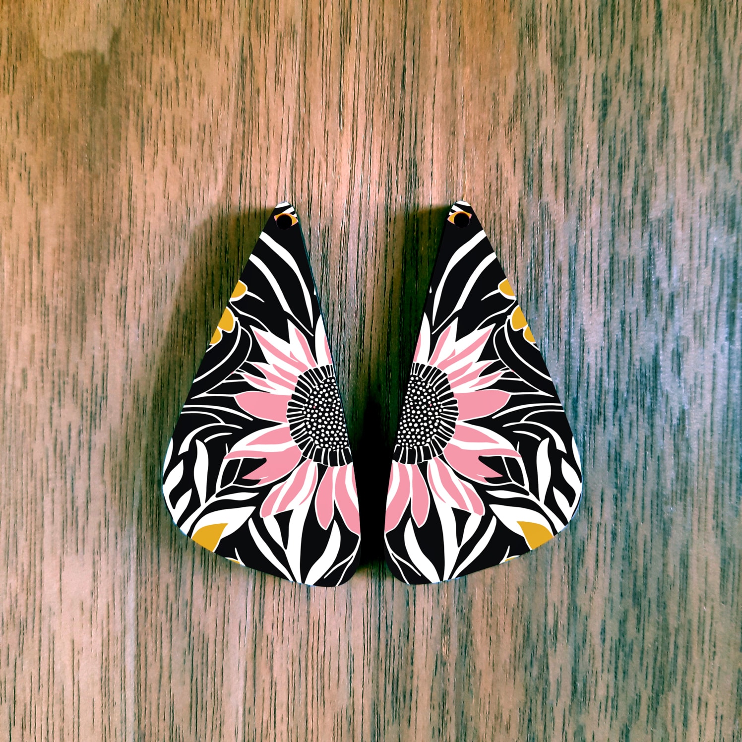 Long black with pink flower earrings. It has a 1.8mm hole at the top and plain wood at the back.
