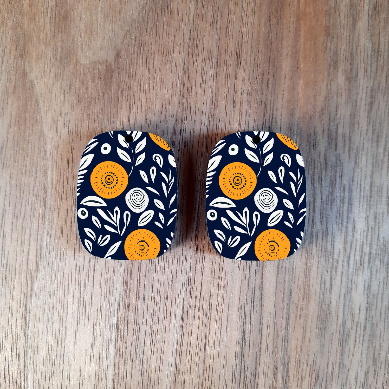 Navy blue with yellow flower earrings. It has a glossy finish with plain wood at the back.
