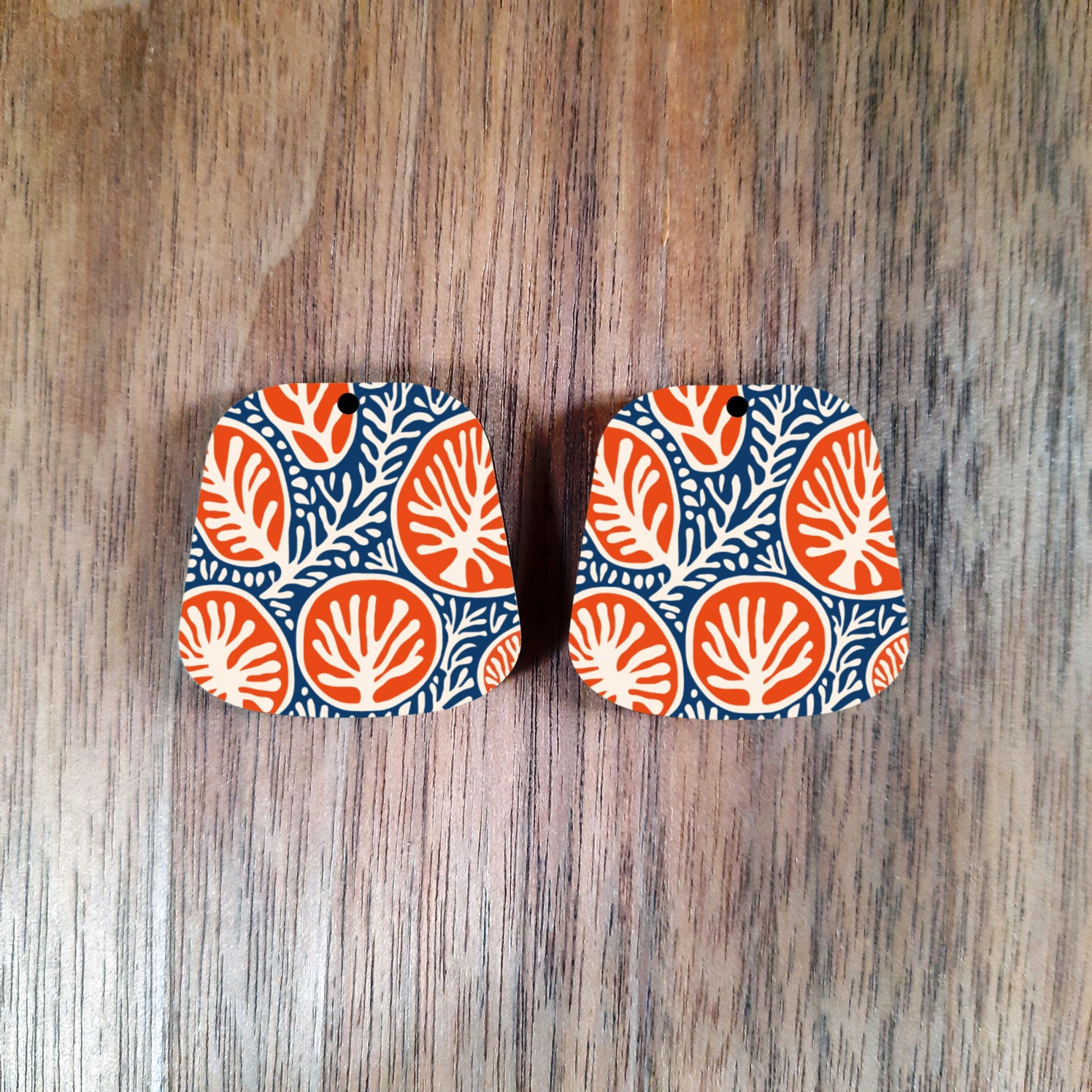 Orange with navy leaves. It has a glossy finish and is painted dark grey on the back.