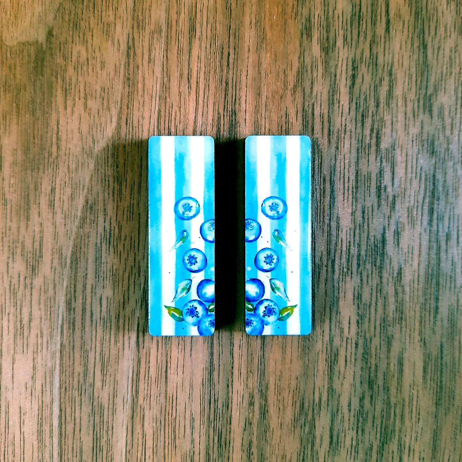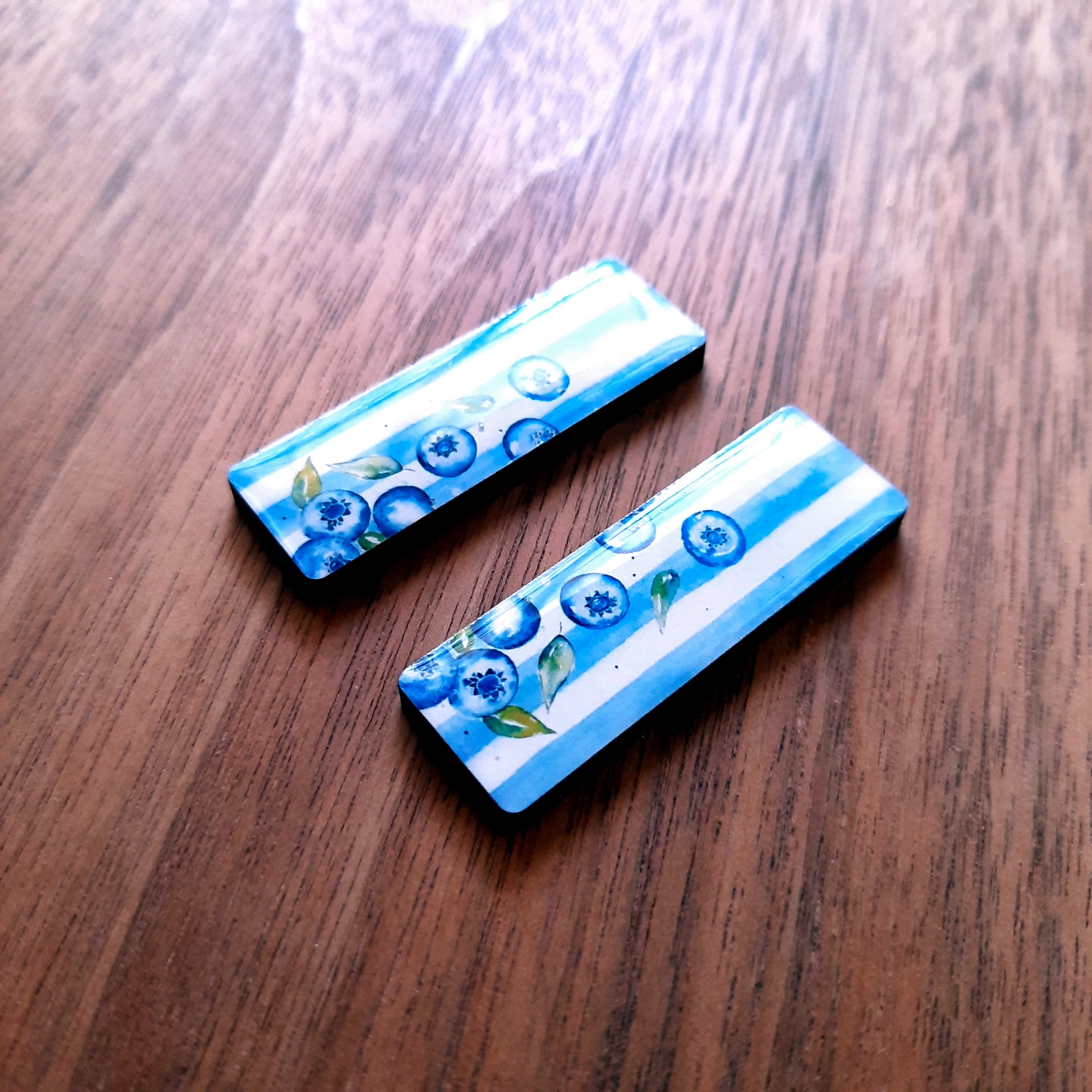 Rectangular blueberry epoxy earrings with no holes.