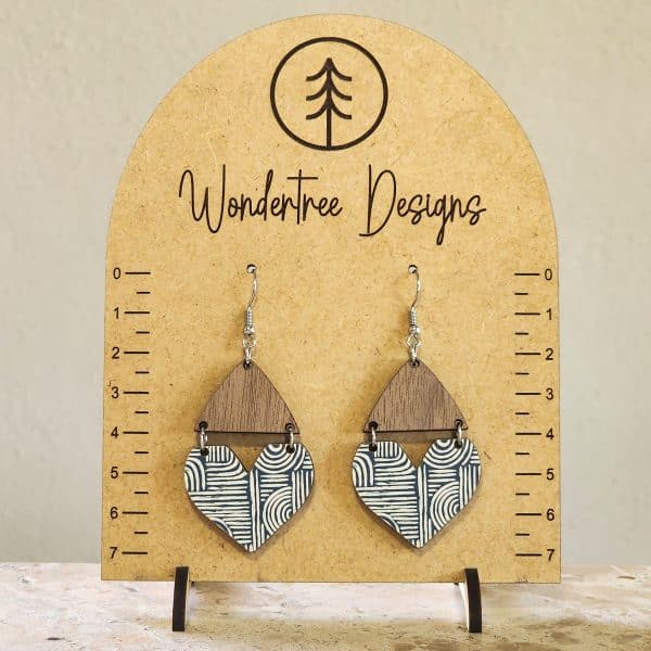 Two-part heart-shaped blue with white stripes earring set. It comes with walnut connectors. The holes are 1.6mm.